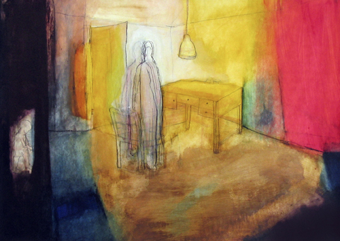 Franziska Möbius taucht ihre Bilder in eine lichte, warmtonige Farbigkeit, die eine fast lyrische Atmosphäre entstehen läßt. Sie benutzt vorwiegend Aquarellfarben aus eigener Herstellung auf wenig saugfähigem Papier, durch Wegwischen entstehen Überlagerungen. Die Figur tritt als rauschhafte Bewegung in den sie umgebenden Raum und geht über in eine scheinbare Irrealität. Die so entstandene Szenerie täuscht die menschliche Wahrnehmung, sie führt den Betrachter ins Innerste der eigenen menschlichen Emotionen und Erinnerungen. Manche Figuren haben den Bildraum bereits längst wieder verlassen, aber man spürt, dass sie dort waren. Franziska Möbius‘ Bilder haben keine Titel, sie lassen dem Betrachter Raum und Zeit für Persönliches.