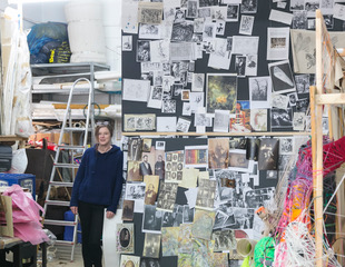 Townes Van Zandt, der leider zu früh verstorbene texanische Musiker, singt seine melancholischen Songs, Bilder hängen von der Decke, eingebunden in bunte Wollnetze, Leinwände in Regalen, Werkzeug , Aschenbecher, Farben, Pinsel auf dem Boden, an den Wänden stapeln sich mit Wollfäden bespannte Bilderrahmen. Ein Atelier im Hinterhof, wie aus dem Bilderbuch, ist die Arbeitsstätte der Malerin Charlotte Malcolm-Smith. In Schottland geboren, lebt sie seit den 1980er in Deutschland. In London hat sie Kunst studiert. Nach dem Abschluss geht es nicht weiter, London ist zu dieser Zeit „Freud, Bacon, Auerbach" oder andersrum „Auerbach, Bacon, Freud" - lacht! Sie bewirbt sich am Städel in Frankfurt und aus den geplanten zwei Semestern wird noch mal ein Vollstudium bei Christa Näher. Deutschland ist aufregend, an der Städelschule in Frankfurt lehren Immendorf, Kirkeby, Herold und Richter, das Who is Who der bundesrepublikanischen Malerei geben sich hier die Klinke in die Hand. „Die Wilden sind dran, alles ist möglich - auf der Hanauer gab es Ateliers für ganz kleines Geld." Danach aber erstmal Berlin, 2005 kommt sie nach Frankfurt und Offenbach (Atelier in der Mato Fabrik) zurück, die „Gentrifizierung des Prenzlauerbergs" hat sie vertrieben.